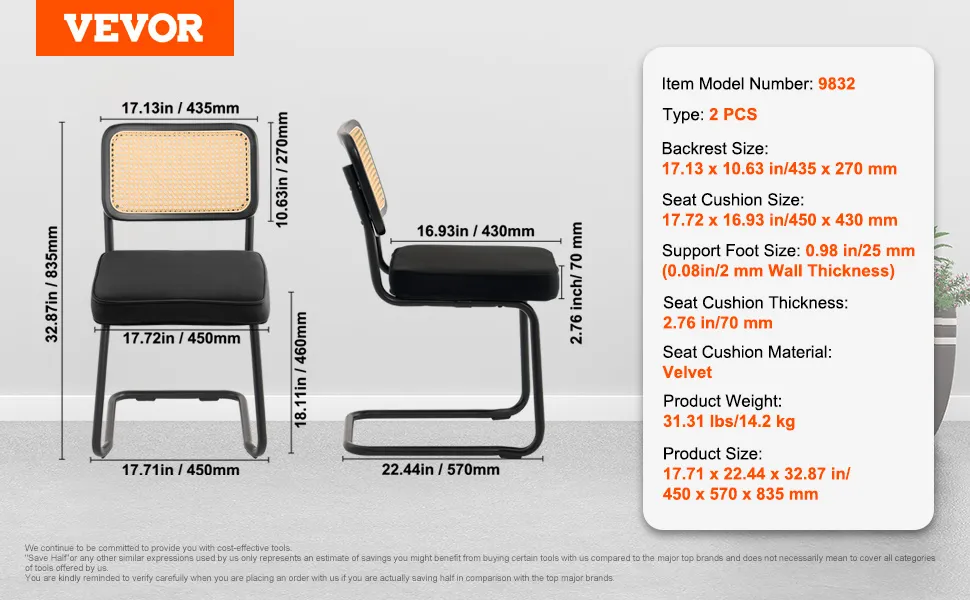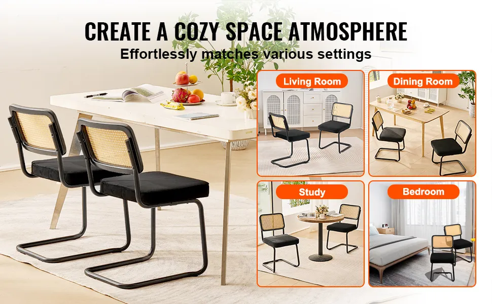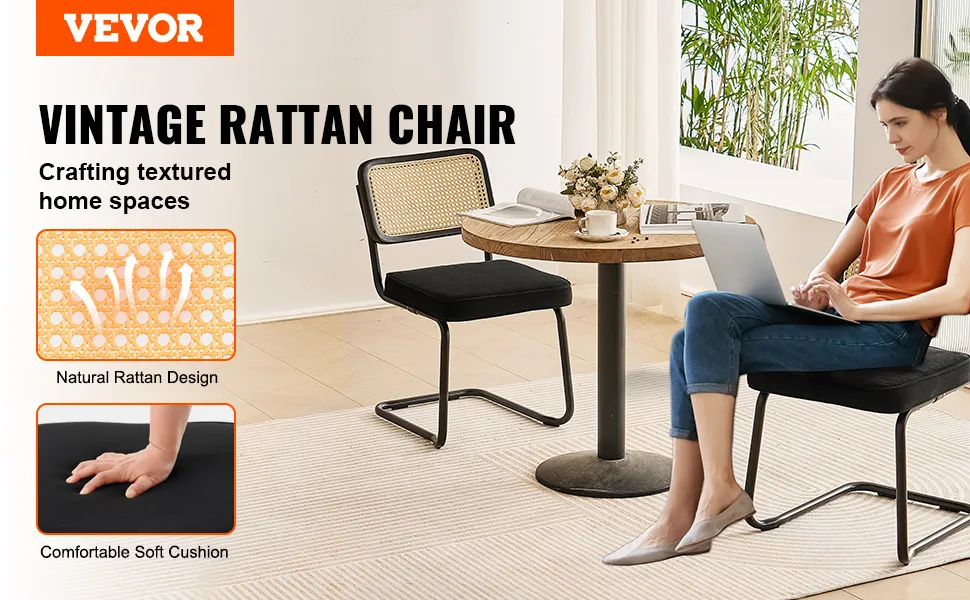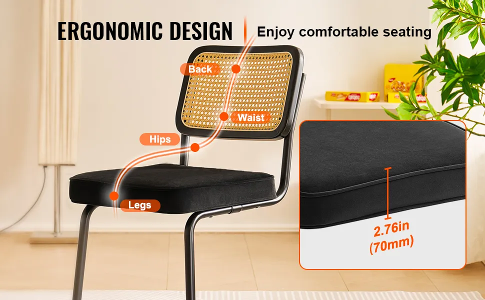 These dining chairs combine comfort and style effortlessly. Crafted with premium PE rattan, these chairs feature a breathable backrest and a plush 70 mm velvet cushion for a cozy seating experience. The rattan back chair design blends retro and modern aesthetics, making it a unique addition to any dining room. Its slightly tilted backrest enhances support, ensuring comfort during long meals. With rounded edges for a softer, refined look, these chairs elevate the aesthetics of any space.