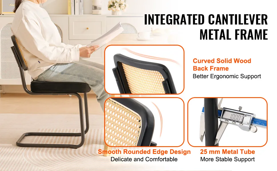 These retro dining room chairs are built for durability with a sturdy cantilever metal frame. This ensures excellent load-bearing capacity and a slight rocker effect for added comfort. High-quality materials make them perfect for daily use, maintaining their style and strength over time. Investing in these chairs means combining durability with refined aesthetics.