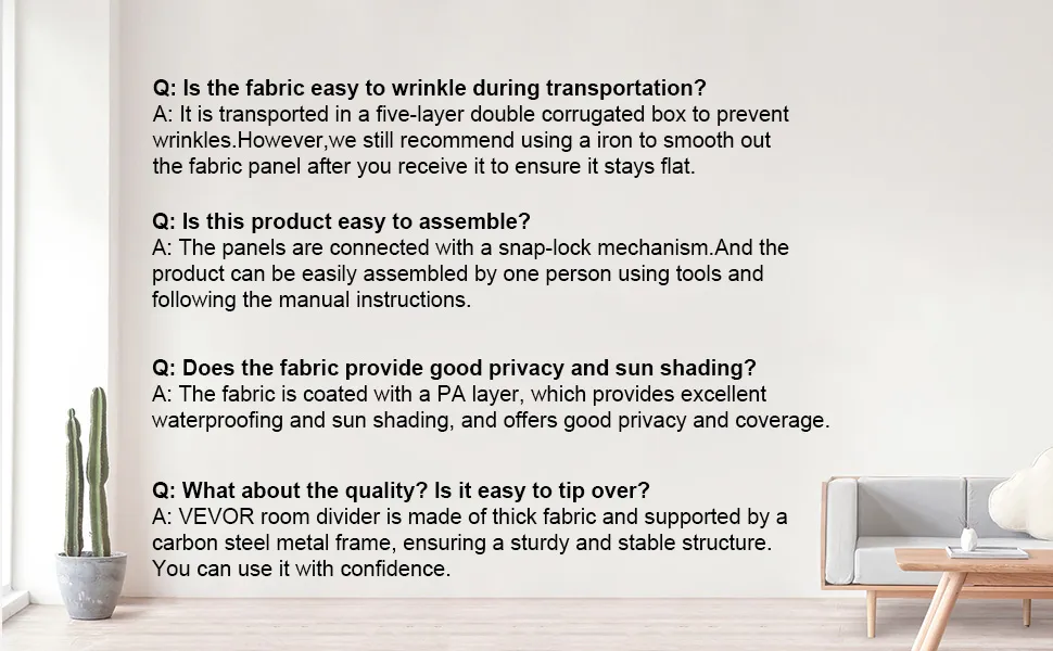 - Hassle-free Assembly: Our portable room divider panel wall can be assembled with screws, making it easy for one person to assemble by following the instructions in the manual. If you want a more efficient installation, it is recommended to use electric tools for installation. Please note that due to the fabric material, we suggest ironing the fabric before assembly. If you have any questions, don't hesitate to contact us.