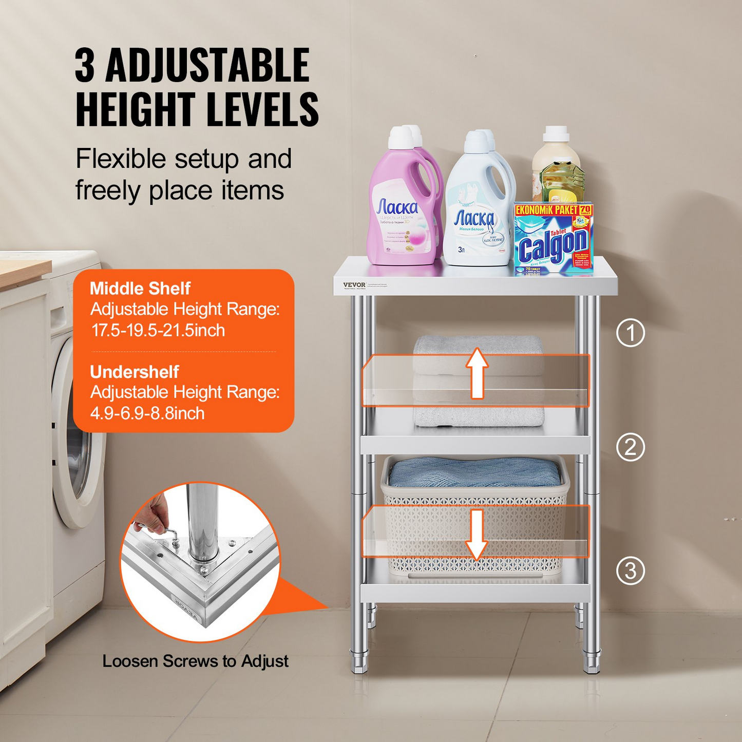VEVOR Stainless Steel Food Prep Table, 14 x 24 x 34 Inch Commercial Kitchen Worktable, with 2 Adjustable Undershelf, Heavy Duty Prep Table Metal Work Table for BBQ, Kitchen, Home, and Garage