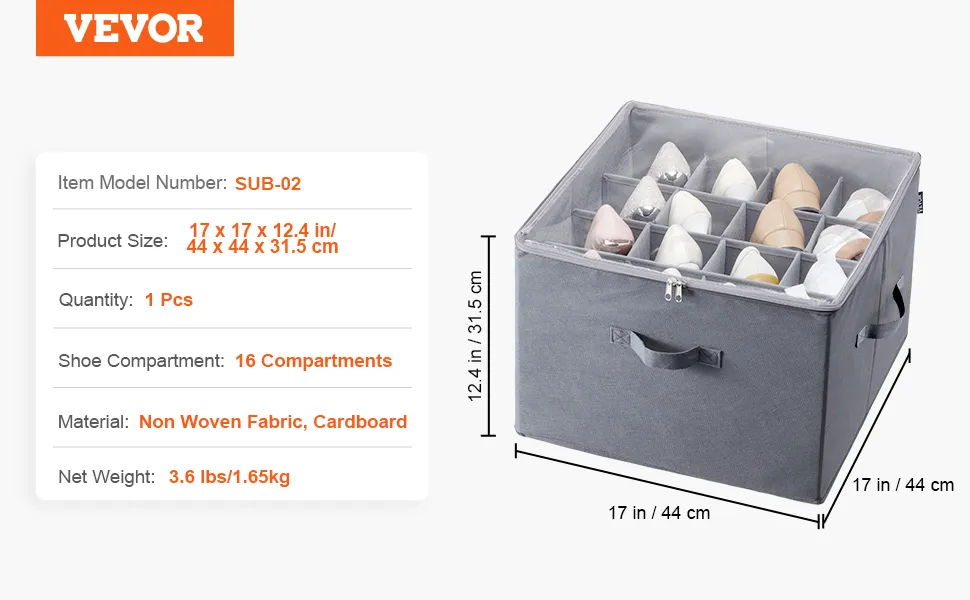 Vevor Sturdy Under Bed Shoe Storage Organizer, Adjustable Dividers Fit 16 Compartments, Shoe Storage Organizer for Closet Organization with Clear Cover, Shoe Rack & Basket, For Closet, Entryway, Trunk, L17"x W17"x H12.4", Grey