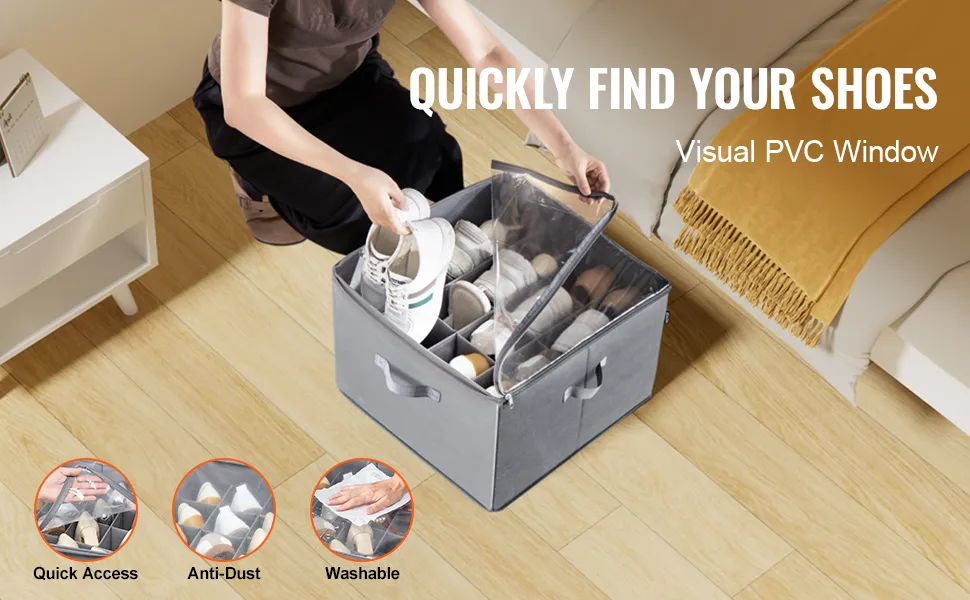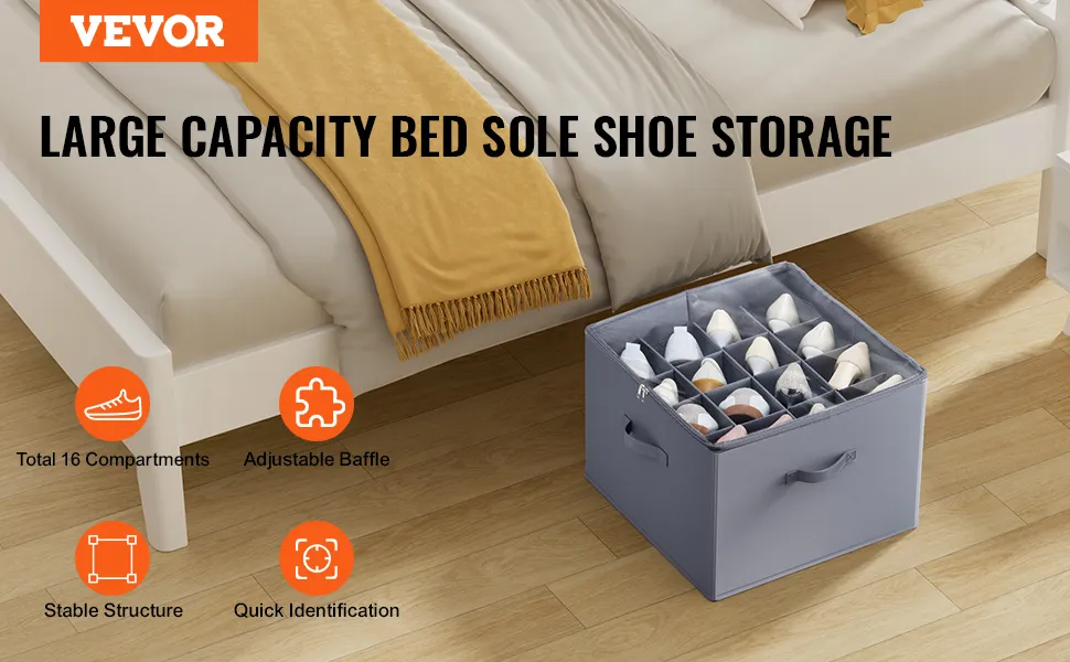 This foldable under-bed storage box includes 16 compartments. The box features adjustable dividers for different types, a clear PVC cover for easy access, and breathable, non-woven fabric that keeps shoes fresh. Ideal for under beds, closets, or sofas, it maximizes your home space.