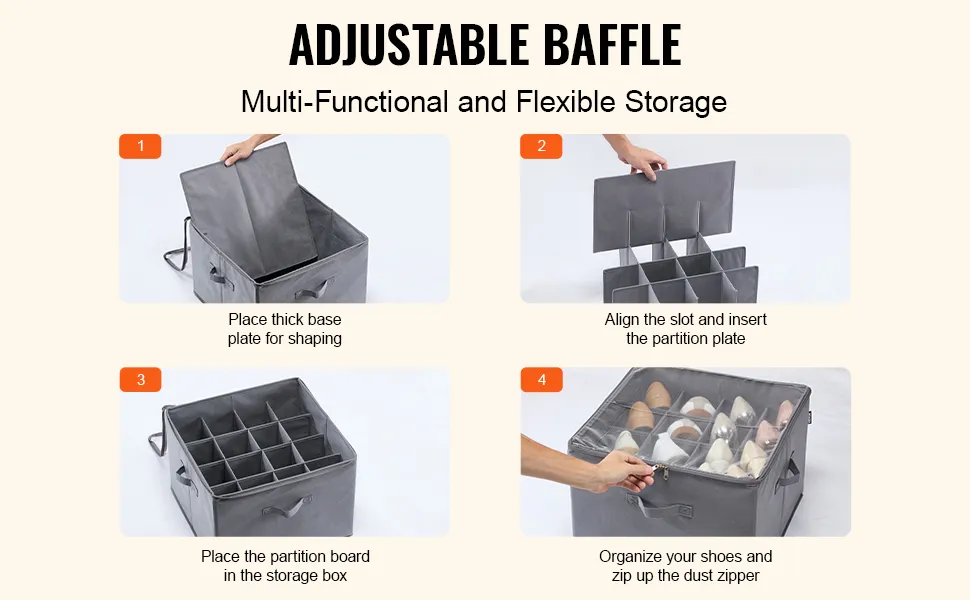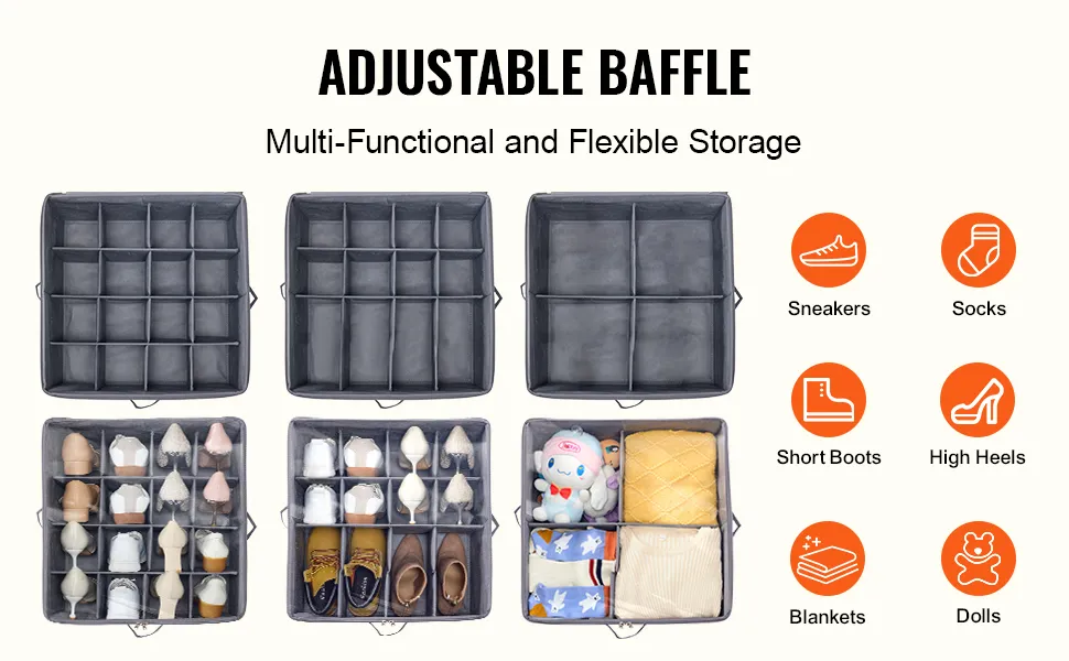 - Flexible Storage Options: You can adjust the number of dividers to suit your needs. In addition to shoes, you can store seasonal clothing, toys, blankets, and more. The 4 mm thick reinforced dividers provide vital support, maintaining the box’ s shape without deformation.