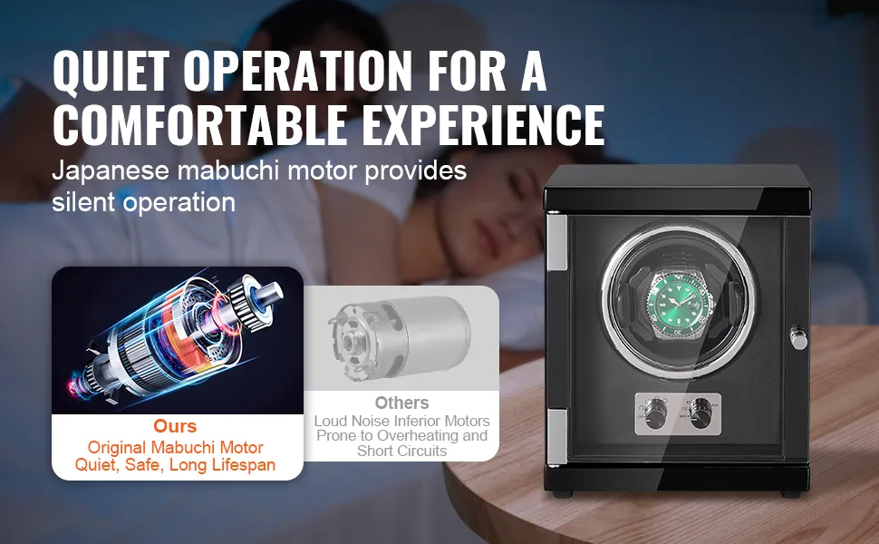 - Durable Mabuchi Motor: To enhance stability and durability, we've incorporated a Japanese Mabuchi motor known for its high torque, compact size, precise control, low power consumption, and long lifespan. Plus, our rotating watch case operates with minimal noise, effectively reducing disturbances and providing a more comfortable personal space.
