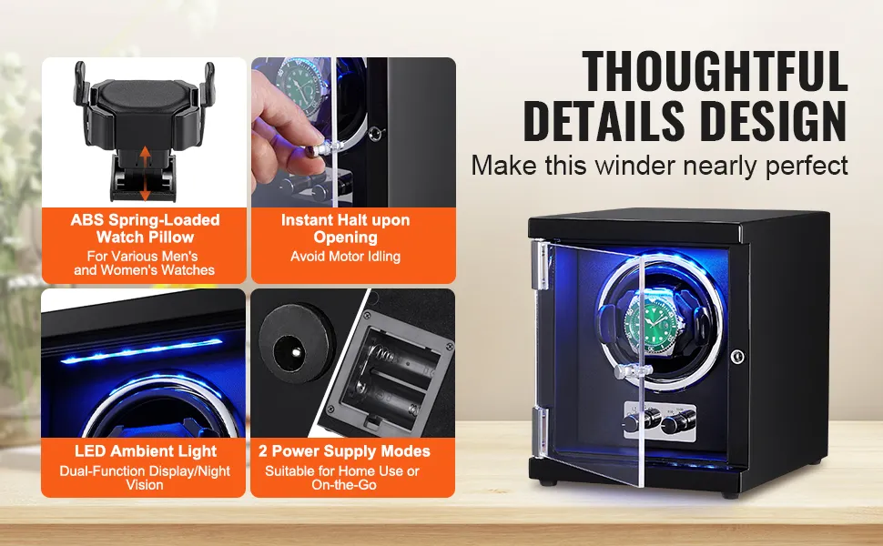 - Practical Details: Our watch box winder features a flexible watch pillow, accommodating watches with various strap lengths. The soft ABS material prevents scratches on your watches. The user-friendly open-lid stop function prevents unnecessary wear on the mechanism while allowing easy access to your watches. The LED blue light adds a touch of luxury, perfect for display and nighttime illumination. With two power supply modes, it's convenient for both home use and portability.